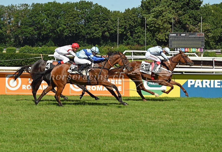 Packender Dreikampf um den Sieg: Pontero (Nicolas Guilbert, Mitte) schlägt Koskoroba (links) und Cri de Lope (rechts).