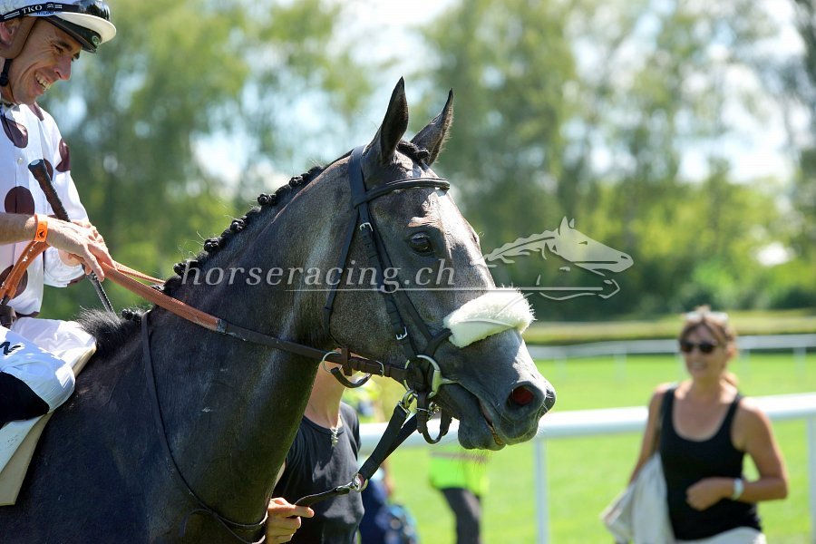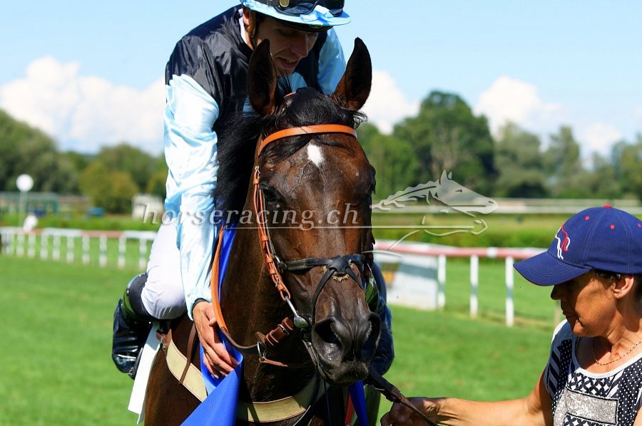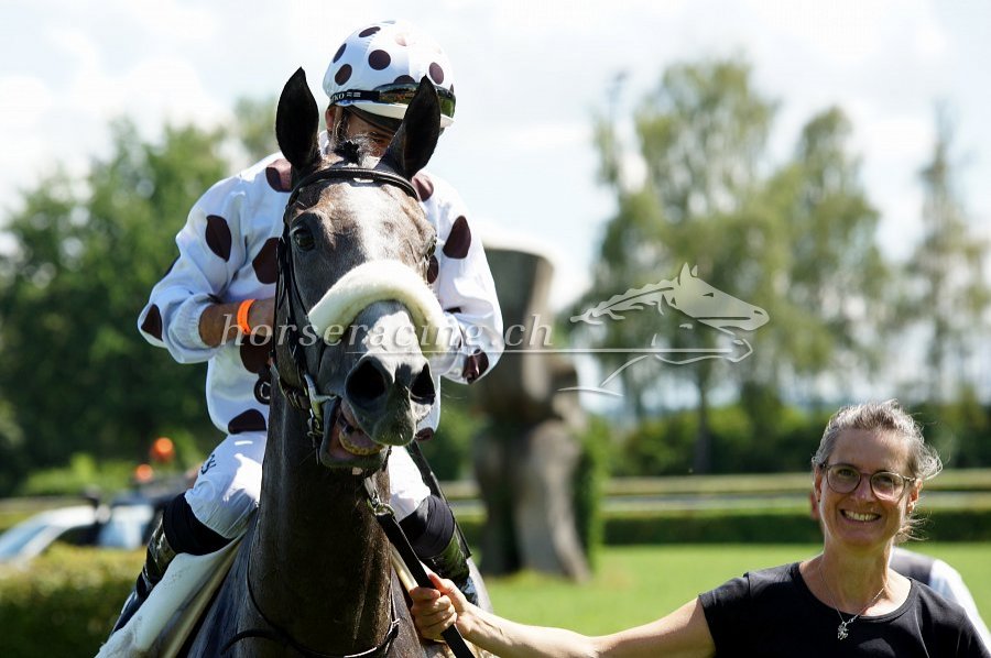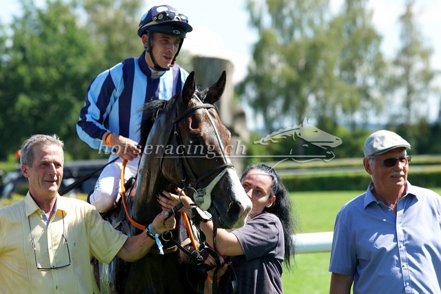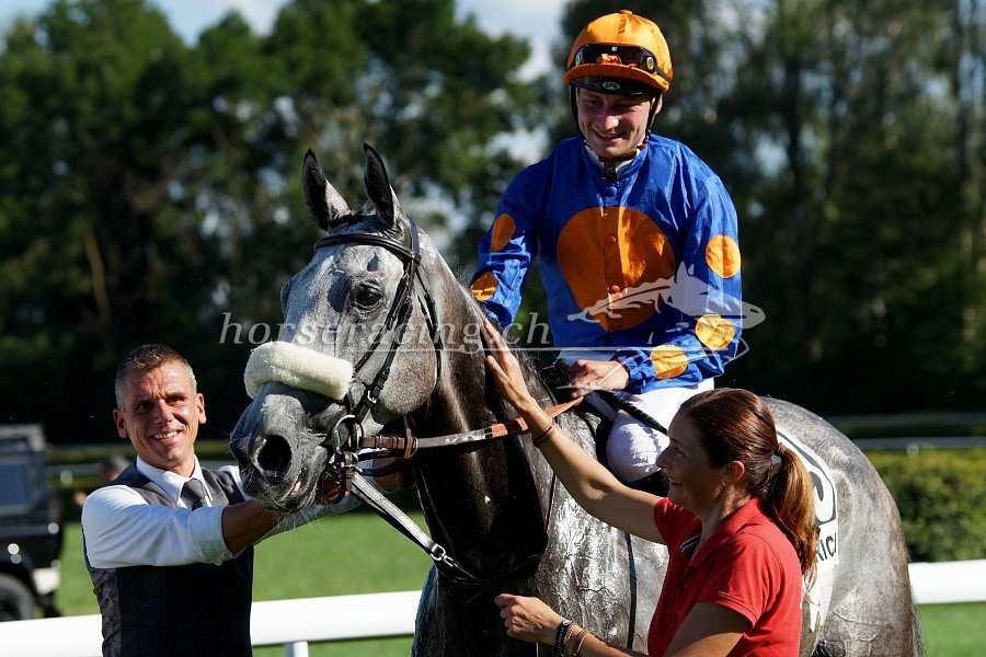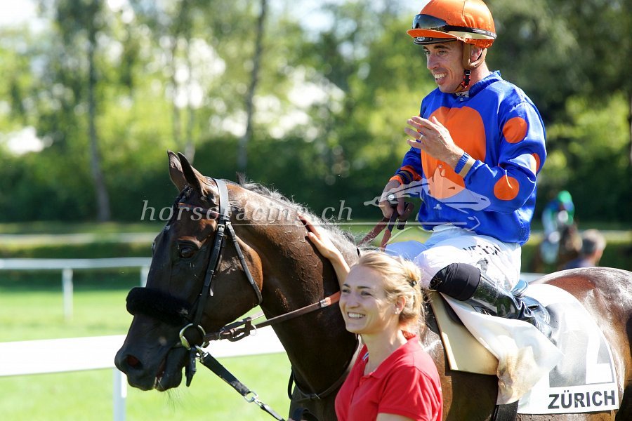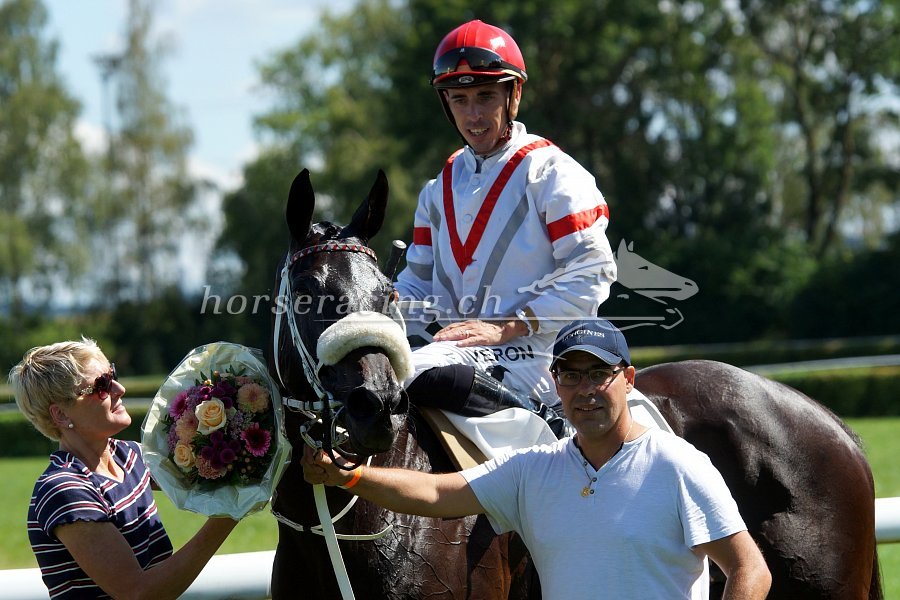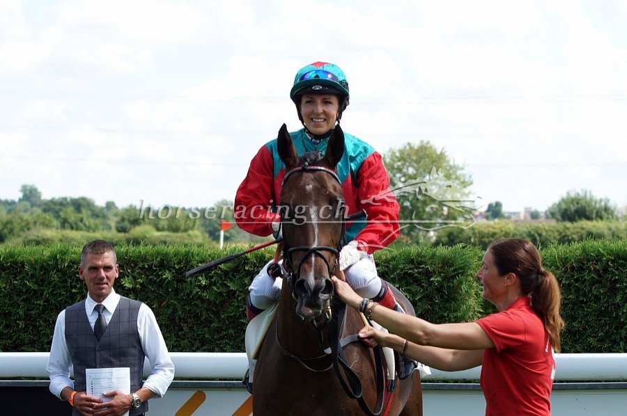 Gold Street mit Jockey Fabrice Veron und Besitzerin/Trainerin Claudia Schorno. Foto von Nathalie Vorburger.