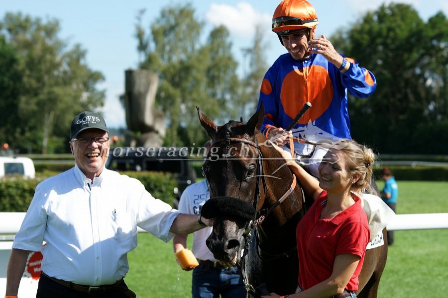 Fabrice Veron freut sich über den Sieg mit Jeföhl - rechts Mitbesitzerin Bettina Lampert. Foto von Nathalie Vorburger.