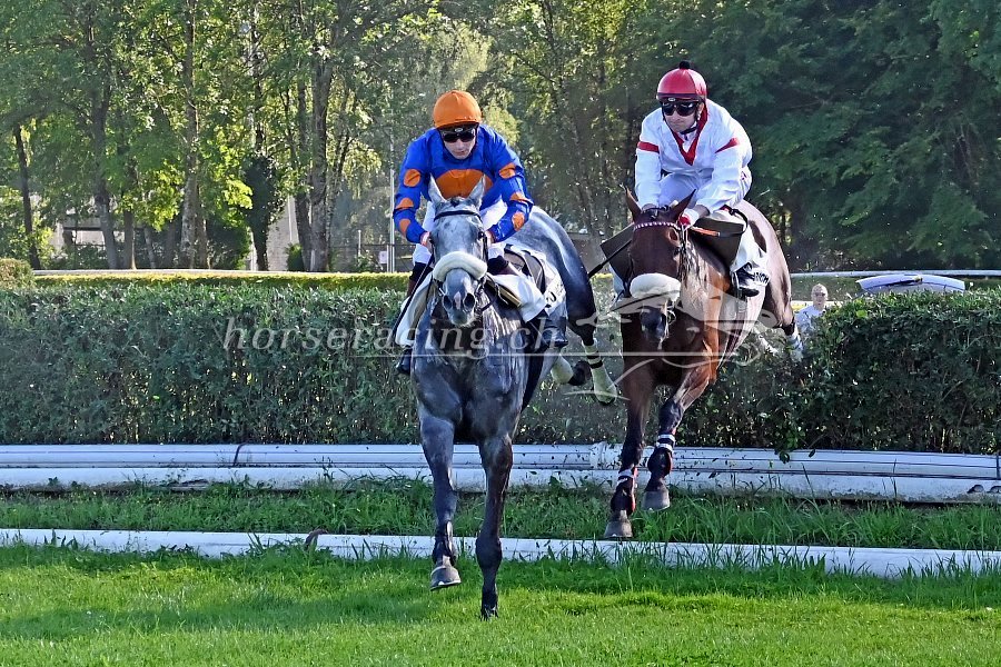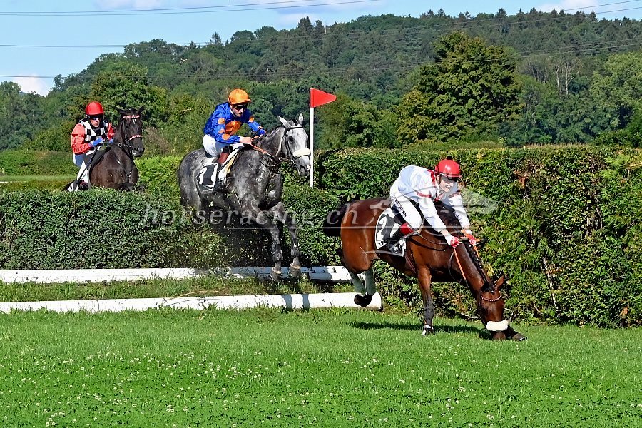Speaktakuläre Bilder aus dem Jagdrennen: Hier der Schimmel Et Quoi (Raphaël Mayeur) sowie Blingless (Dennis Schiergen). Foto von Ueli Wild.