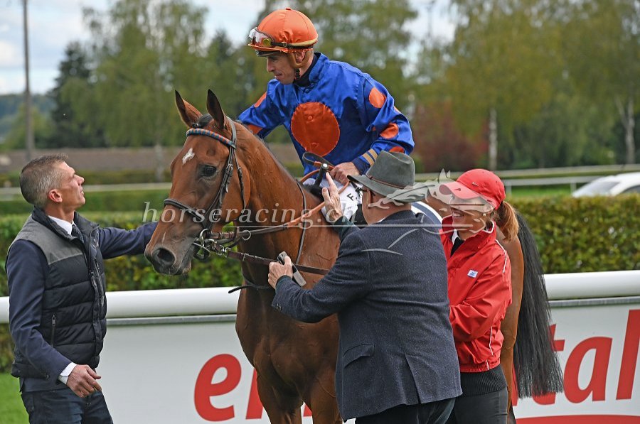 Freude im Lager der Sieger - Trainer und Reiter sind schon bei der Kurz-Analyse, Moderator wie ein Gemälde.