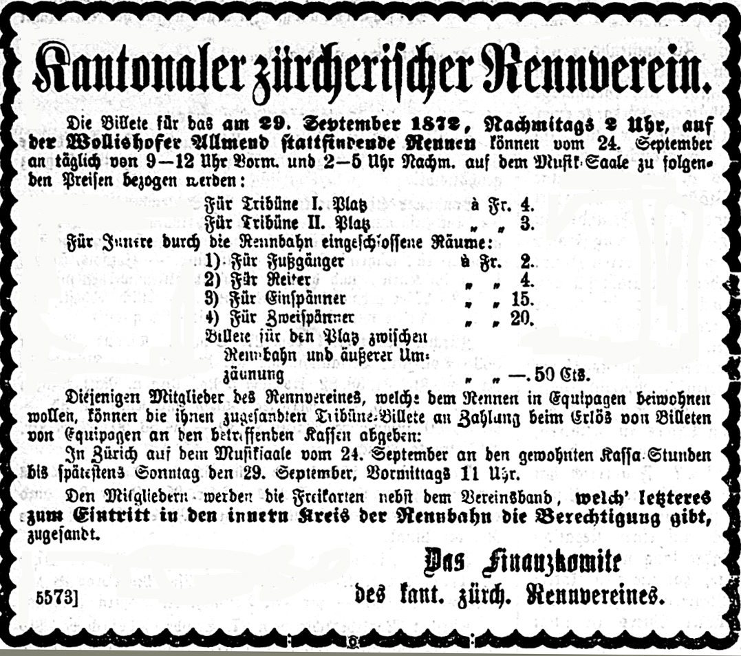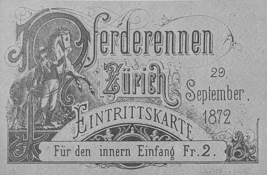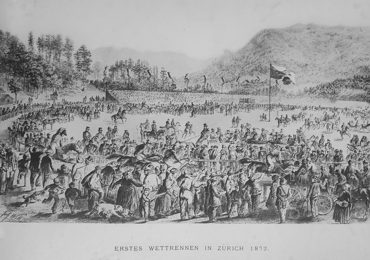 «Über den Wert der Pferderennen ist in den jüngsten Tagen in verschiedenen Kreisen und öffentlichen Blättern viel Richtiges und Unrichtiges gesprochen und geschrieben worden. Ihre Gegner halten sie für Tierquälerei, und solche, die in der Gunst des Volkes stehen oder darum buhlen, titulieren die Wettrennen als Herrenfeste, die dem Lande nichts nützen. Die Absichten des zürcherischen, jetzt schweizerischen Rennvereins und die Bedeutung der Wettrennen in nationalökonomischer und militärischer Beziehung zu beleuchten, ist der Zweck dieser Zeilen. Vor zwei Jahren hat anlässlich des Festes der landwirtschaftlichen Gesellschaft des Bezirks Zürich eine Pferdeausstellung stattgefunden und ist eine Gesellschaft gegründet worden, welche sich die Erweiterung der Kenntnisse des Pferdes und die Unterstützung aller auf die Hebung und Verbesserung der inländischen Pferdezucht und auf die Entwicklung des Reitergeistes gerichteten Bestrebungen zum Ziel machte. Als geeignetstes Mittel zu diesem Zweck wurde die Bildung eines Rennvereins erkannt, wie ein solcher, wenn auch unter anderem Namen, schon seit vielen Jahren in der Westschweiz besteht, wo das jährlich abgehaltene Pferderennen nicht Herren-, sondern wahre Volksfeste geworden sind und zu dem Aufschwung, den die Pferdezucht in jenen Gegenden genommen, wesentlich beigetragen haben.»