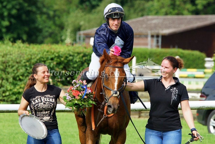 Die Sieger des GP des Kantons Aargau sind auch die Favoriten im GP Schweiz: Bergerac, Jockey Damien Mescam und links Trainerin Chantal Zollet (Foto: Nathalie Vorburger).
