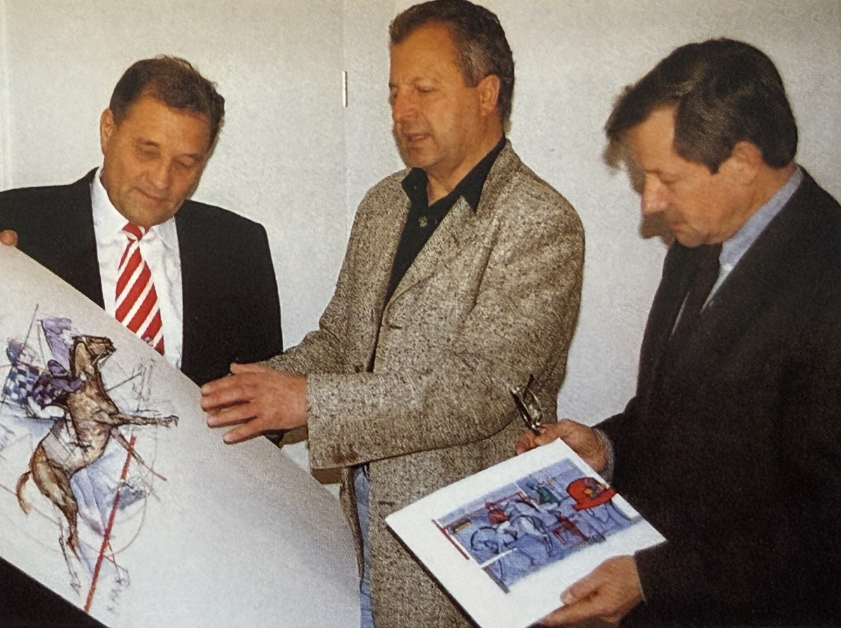 Fritz von Ballmoos einem weiteren Foto in der Jubiläums-Festschrift abgebildet mit dem umtriebigen RVZ-Sponsorenchef Louis Mayer (links) und dem Maler Rudolf Mirer.
