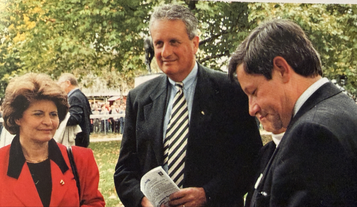 Fritz von Ballmoos (rechts) auf einem Foto in der Jubiläums-Festschrift abgebildet mit Peter Kunz von Ericsson und Wetterfee Bettina Walch.