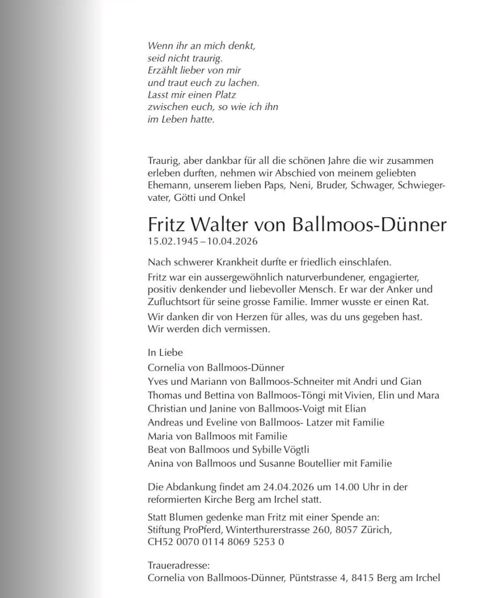 Fritz von Ballmoos ist im Alter von 81 Jahren verstorben.