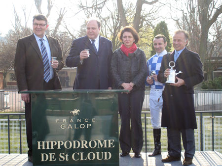 Siegerehrung mit Christoph und Alicia Müller - rechts Trainer Freddy Head, Jockey Davy Bonilla.
