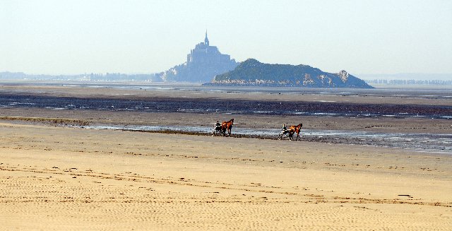"La Baie bei Ebbe" - zwei Traber trainieren bei Genêts am Strand, im Hintergrund erheben sich der Mont Saint-Michel und der unbewohnte Fels Tombelaine aus dem Watt.