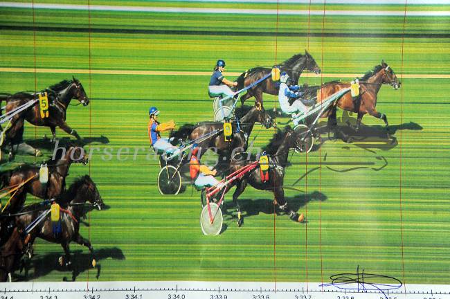 Das ominöse Zielfoto: Hinter der Siegerin Racing Fox kommt Ramona Lap (innen) deutlich vor Rossini du Marzta (im Vordergrund, roter Dress) als 2. ins Ziel... (Foto vom Foto: Ueli Wild)