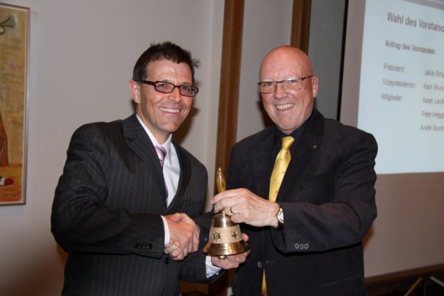 "Glocken-Übergabe": Der scheidende Präsident Anton Kräuliger (rechts) mit Nachfolger Köbi Broger (Foto: Jürg Schranz)