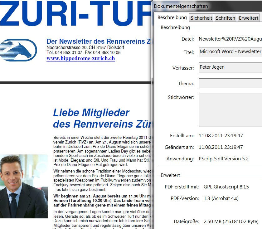 - Die obige Traktanden-Liste brachte zudem noch eine Überraschung an den Tag. Köbi Broger, der als Unternehmer im Bereich IT über spezielle Kenntnisse verfügt, konnte aufzeigen (und dies lag ebenfalls auf dem Hellraumprojektor vor), dass die Traktandenliste von Peter Jegen verfasst worden war. Von jenem Redaktor der Neuen Zürcher Zeitung also, der in einem NZZ-Artikel am Samstag vor dem August-Renntag den RVZ lobte, Jean-Pierre Kratzer hingegen attackierte.