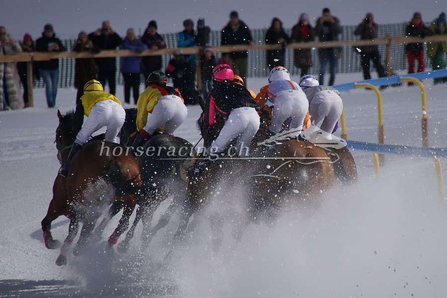 Die Spitzengruppe des Grossen Preises von St. Moritz 2018 im ersten Bogen (Foto: Scarlett Schär)