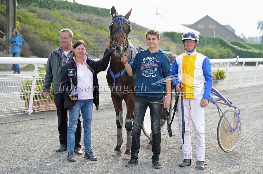 Überlegener Sieg im 20'000er: Flashdance mit Fahrerin/Besitzerin Barbara Aebischer, begleitet von ihrer Mutter Marlies Schneider und von Trainer sowie Ehemann René Aebischer (Fotos: Ueli Wild).