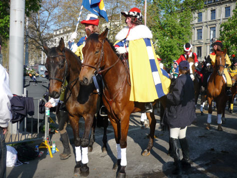 Despot mit seiner Besitzerin Maya Günthardt am Sechseläutensamstag nach einem 2stündigen Ritt von Küsnacht durch die Stadt Zürich zum Albisgüetli, wo die Reitgesellschaft Wiedikon jeweils ihre Probe fürs Sechseläuten durchführt.