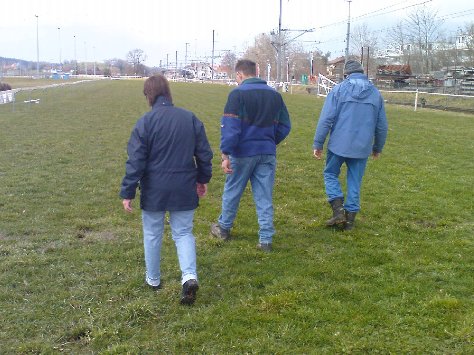 Die Crew mit Bahnchef Res Minder inspiziert die Bahn nach der Fahrt