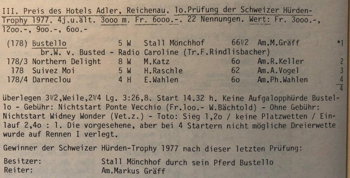 Bustello gewann an jenem Tag in Maienfeld mit Markus Gräff überlegen als 1.20:1-Favorit und war auch Sieger der Hürden-Trophy 1977.