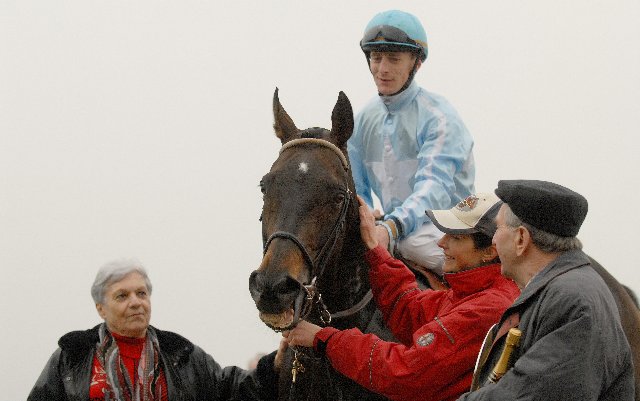 Paul und Trudi Zöllig mit ihrem Parade-Galopper Glavalcour (Mathias Sautjeau) nach seinem letzten und bisher einzigen Saisonsieg am 6. April 2008 in Avenches (Foto: Ueli Wild)